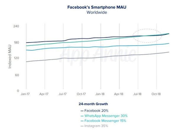 De acuerdo con el informe, WhatsApp desplazó a Facebook desde septiembre de 2018, cuando se refiere a usuarios de aplicaciones móviles. Según los datos más recientes, WhatsApp ya cuenta con más de 1,500 millones de usuarios mensuales de los llamados “activos” (que usa la herramienta al menos una vez al mes), aunque estos números son de diciembre de 2017.